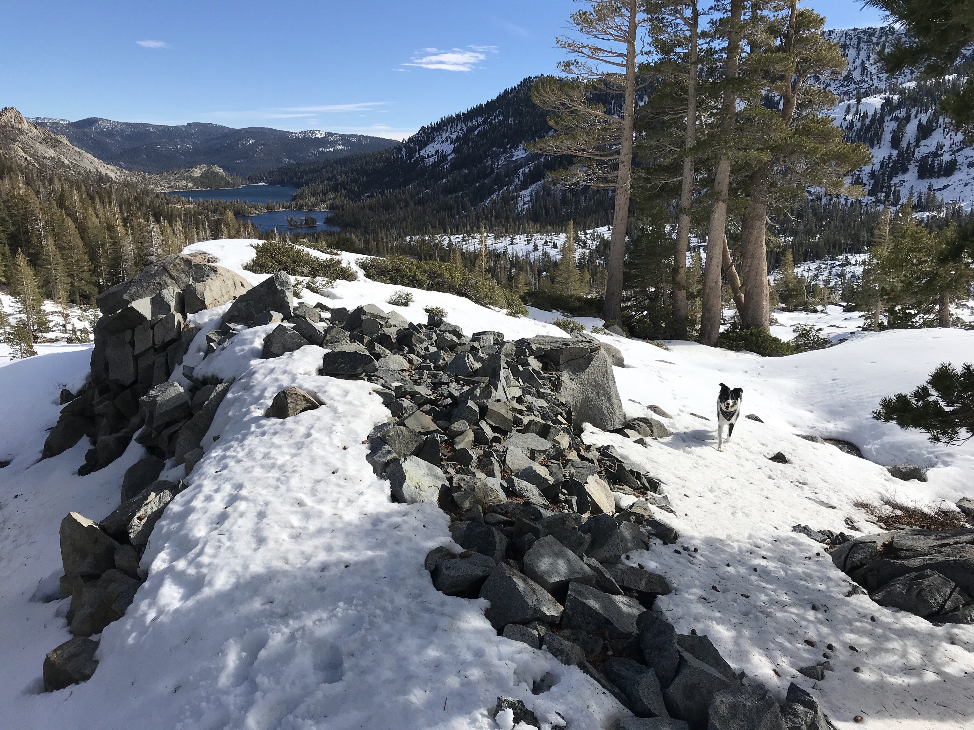 On Thanksgiving my momma took me, Lolo & my daddy to the Echo Lakes trailhead to hike out to Lake Aloha in Desolation Wilderness. It was a very windy start, but otherwise quite warm (for November!) and sunny which had dried up most of the wet snow. As we climbed higher there was a lot more melty snow and the trail turned into a waterfall cascading down the hill. Higher even more and we got into deep snow as you can see in this picture of me standing on the snow lumps.