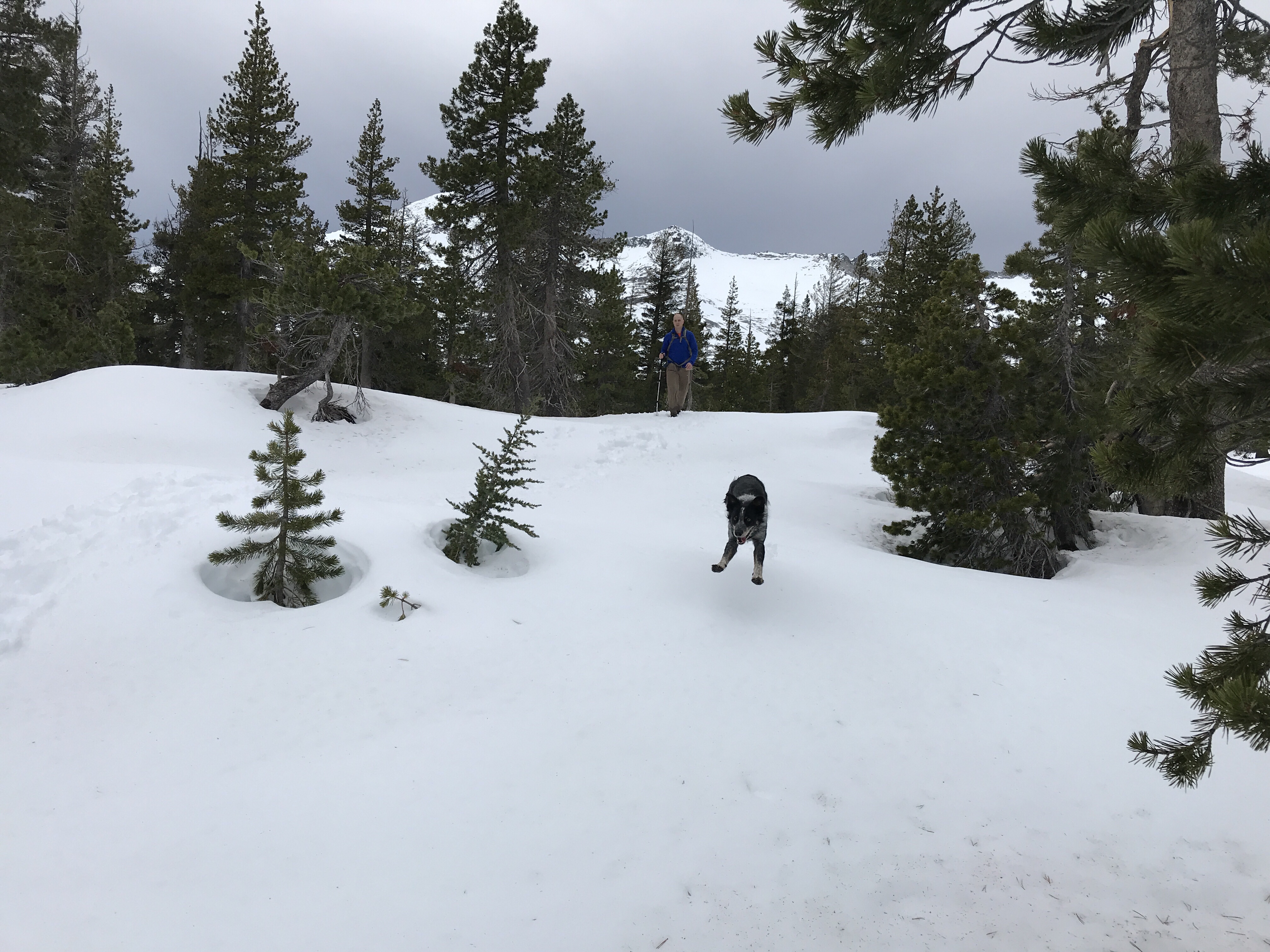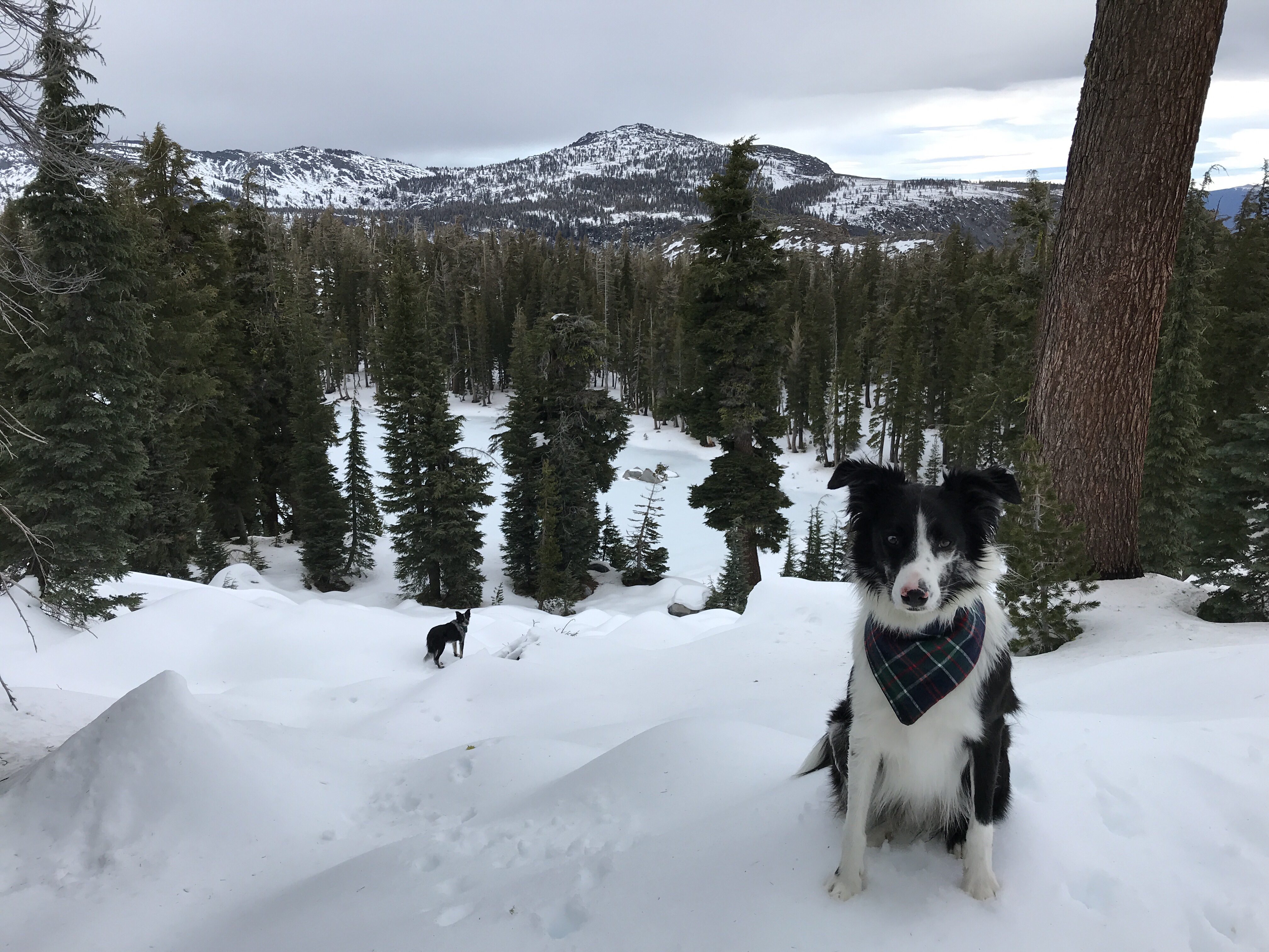 It got much colder the closer we got to Lake Aloha and after 6 miles of walking momma knew she had to take a shortcut so we could at least make it in and out before it got dark. That’s the great part about winter – everything is covered in snow so you can make your own trail! We cut down a hill and made it to Lake Aloha and had a quick snack because it was too cold to hang out. My daddy couldn’t really tell what or where Lake Aloha was because it was all frozen over and covered in snow! Momma tried to point it out but unless you’ve seen all the islands of Lake Aloha when it is not a frozen tundra, you really can’t see it I guess.