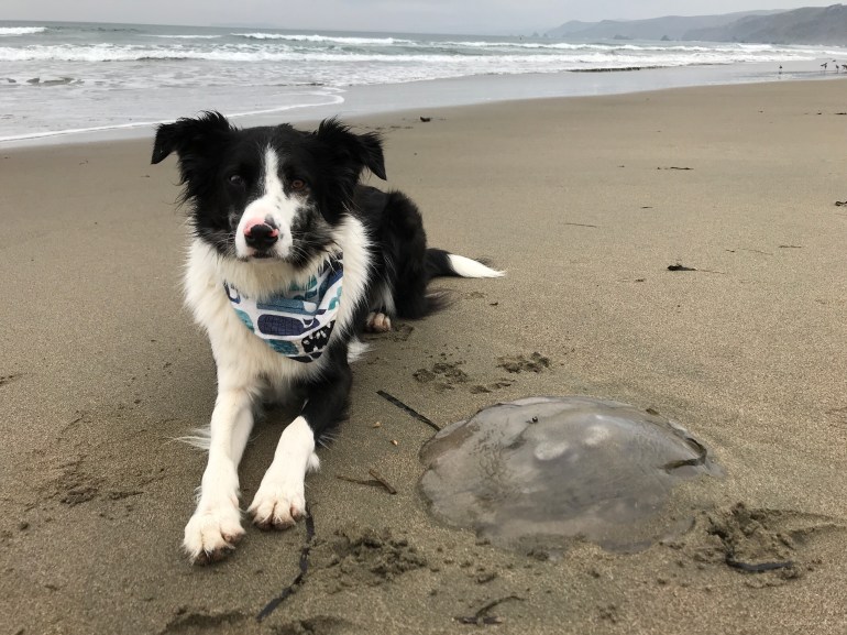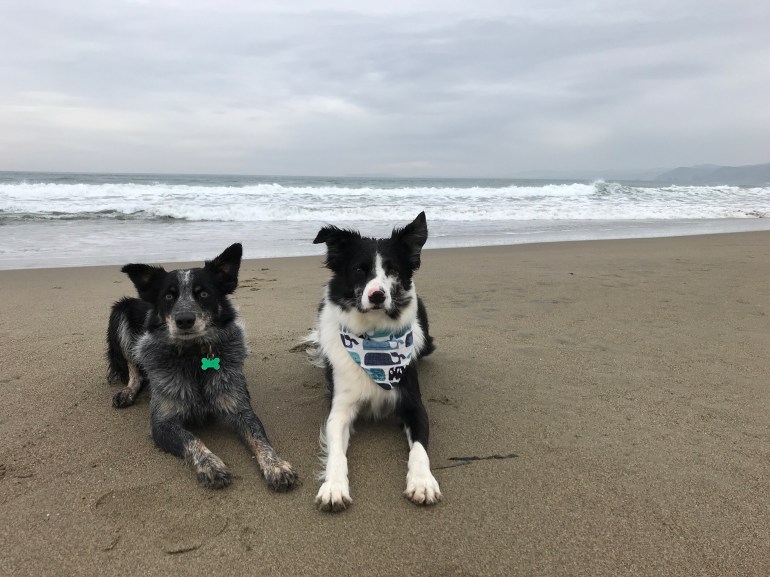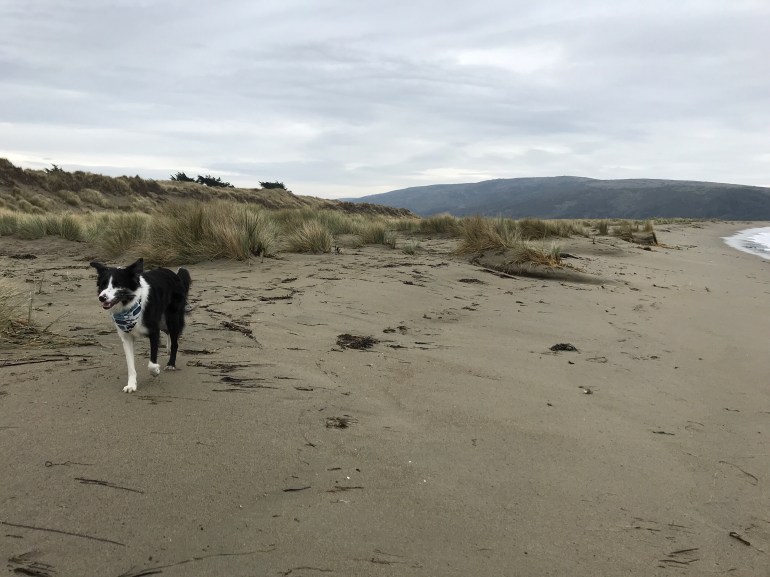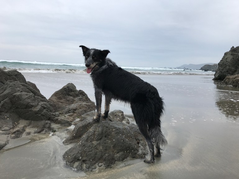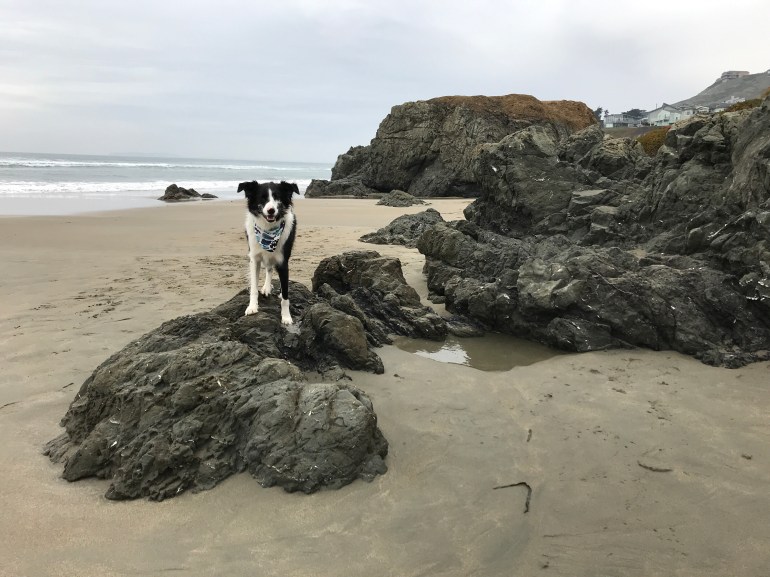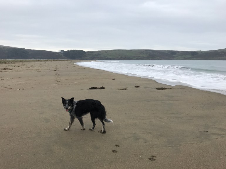 The beach is called Dillon, and we discovered once we arrived that it is right at the mouth to Tomales Bay. If you’ve been following my blog you will remember that we took an overnight paddle-in camp trip in Tomales Bay in December with our friend Amy and spent much of the evening keeping the coyotes away from our camp!! Anyways, Dillon charges $10 to park at the beach lot, but has bathrooms and allows all dogs (under control) to be off-leash south of the seasonal creek.