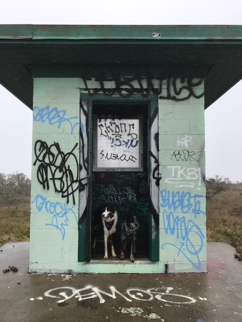 We started out on the Coast Trail but there are a million side trails to go see old bunkers that wander off the main trail and so if you weren’t paying attention you could definitely lose your way in the fog. We only went off the trail on purpose, and then momma knew where we could meet back up with the trail AFTER bush-whacking a bit š