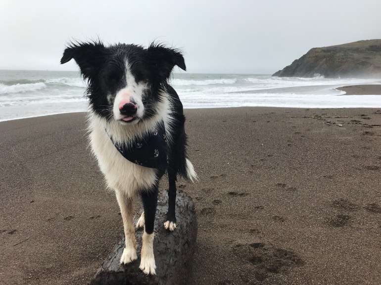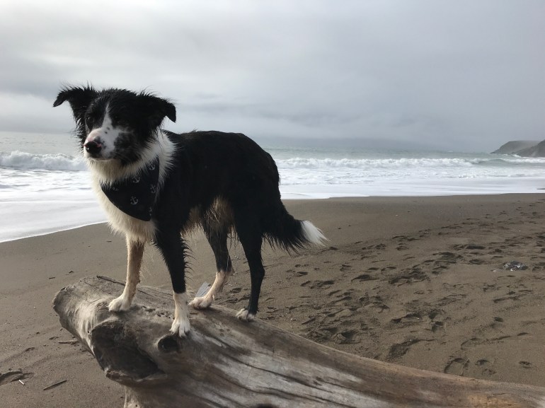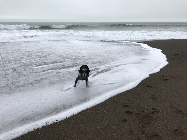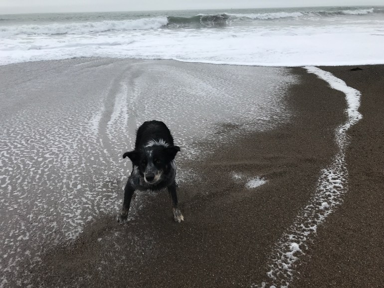 We went down to the end of the beach but couldn’t get back to where we normally go because the tide was high and the waves were pushing really high on shore. It didn’t stop Lolo from playing fetch or momma from taking pictures of me since it was really pretty out.