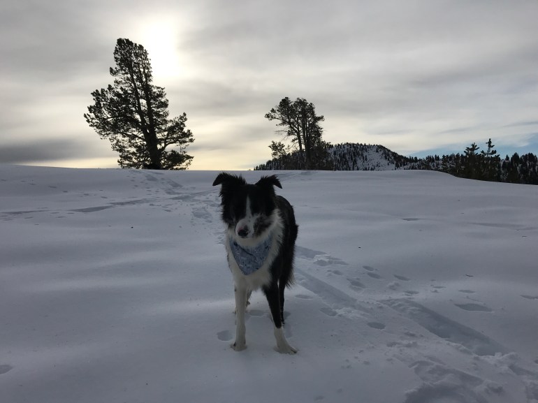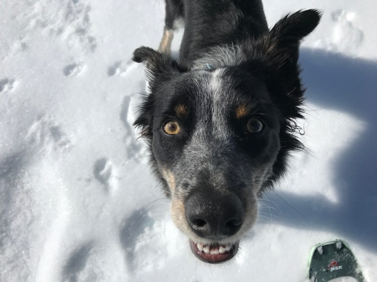 We dropped into the meadow and crossed over to the trails on the other side and picked our way up the mountain – sometimes stumbling on the trail, sometimes not. That’s the fun part about when momma has snowshoes on, we can go wherever we want! There were some places where even with the snowshoes momma was sinking in quite a bit with the crunchy snow – and sometimes even I was totally post holing! I started to get a bit annoyed with it after a while, actually.