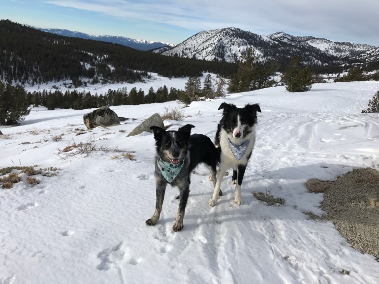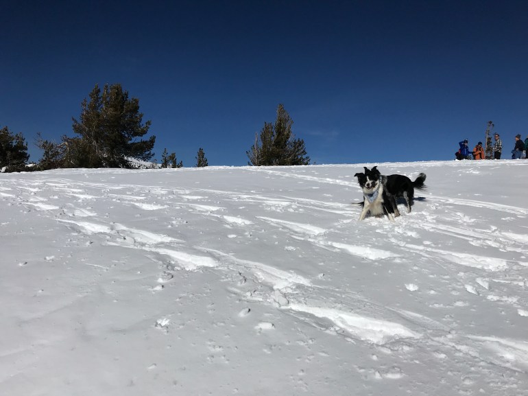 Momma doesn’t want us to go meet people on our own, so she kept us next to her. She can’t deal with leashes with trekking poles and snowshoes so she had to keep reminding us to stay with her because a group of people was whistling at us and wanted us to come over to them! Momma was proud of us for staying with her. She doesn’t mind us meeting other people if they have dogs with them, but when they don’t have dogs sometimes Lolo thinks they are weird and scary so she tries to be in strict control of those situations, which she couldn’t do huffing and puffing like that on snowshoes in deep powder!