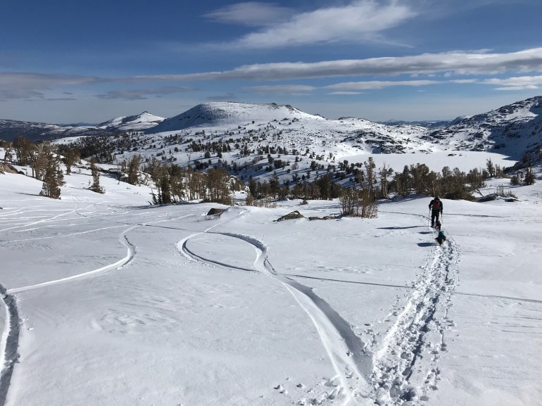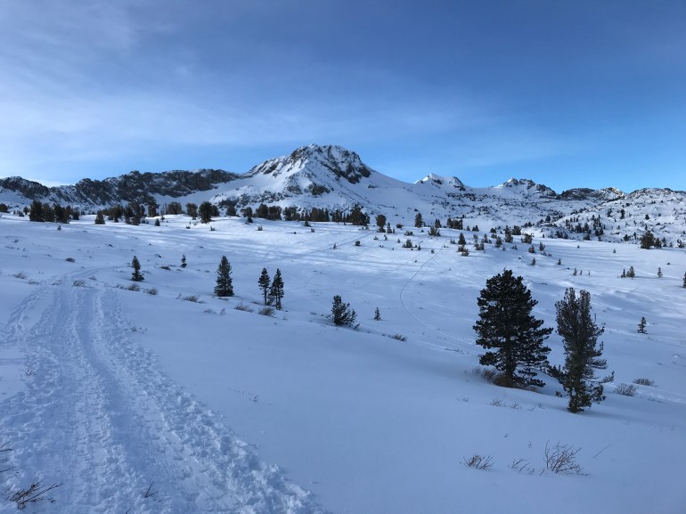 Eventually I figured out that if I stayed in the snowshoe track or the skin track, there was less loose snow to get balled up in my toes, so that’s what I did.