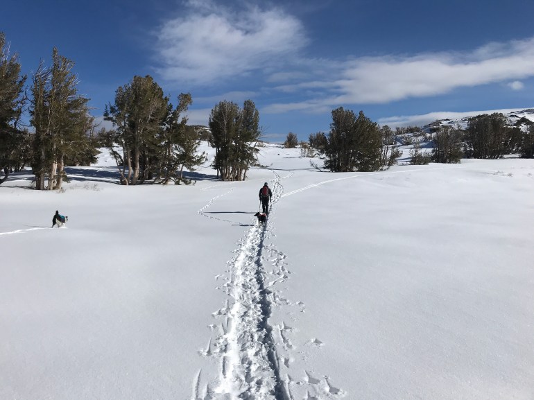 When we got to Lake Winnemucca momma and daddy had to decide where to go next. It was cold enough that we weren’t trying to just hang around and enjoy the scenery you know, and even though momma wanted to go snowshoe across a frozen lake she wasn’t TOTALLY sure it was frozen enough for doing that on! And can you imagine falling in when it was THIS COLD out? Me neither!