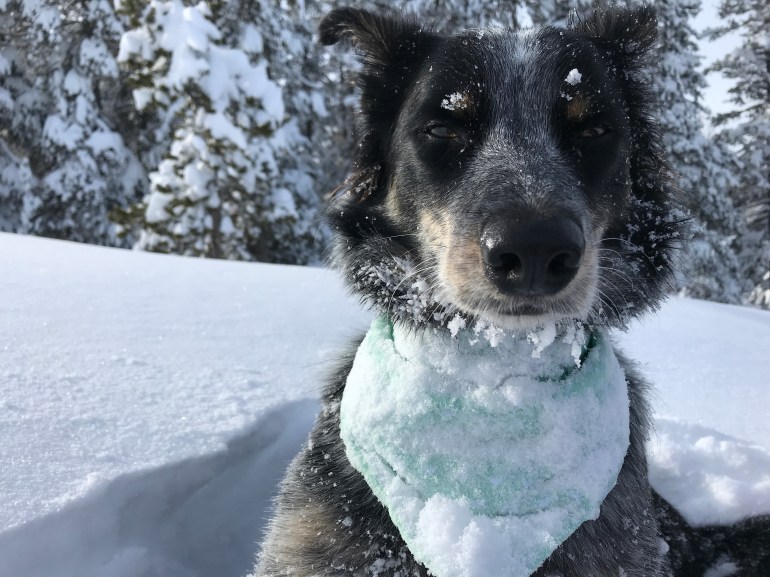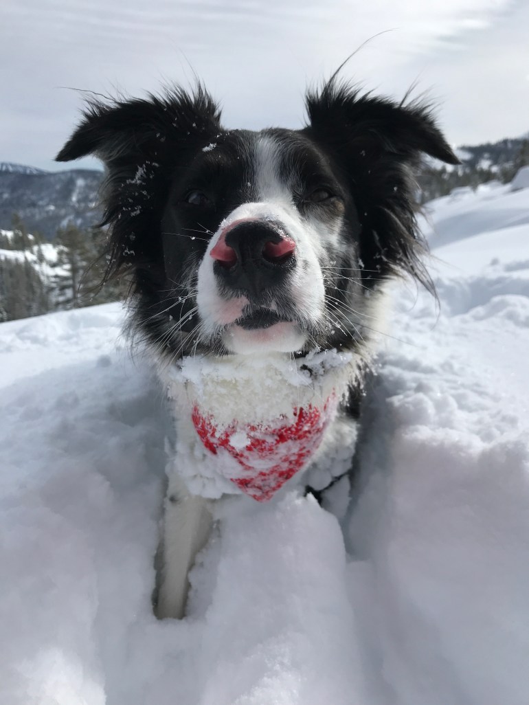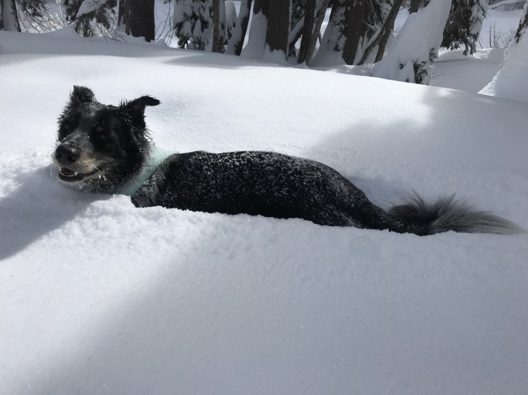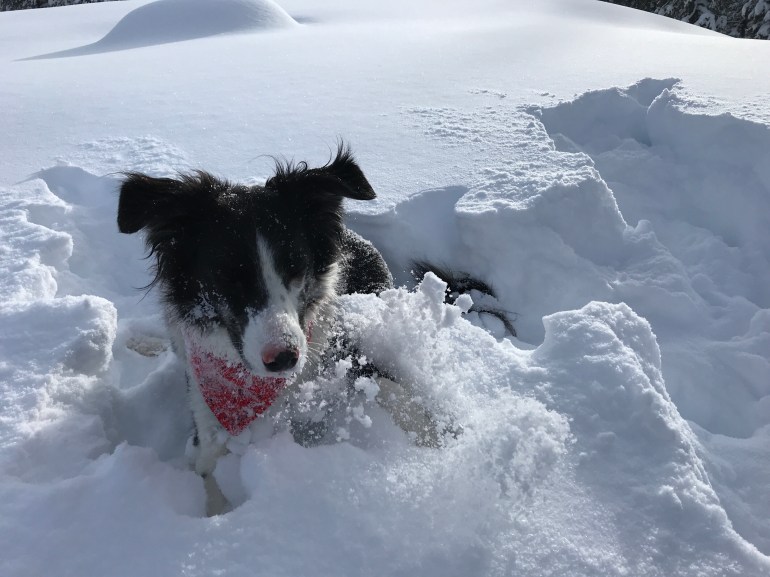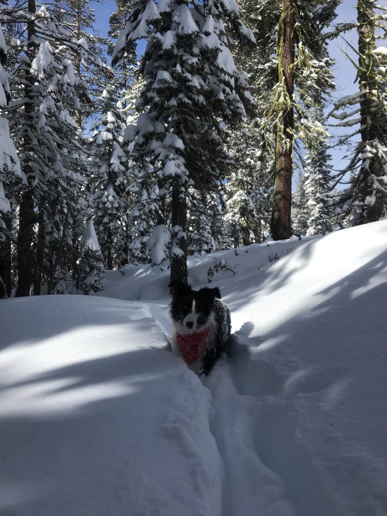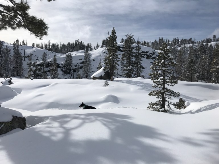Once we got back to where the PCT splits off, momma said she wanted to go see if the tunnel under the highway was gushing with water. Why she wanted to do that NOW, I don’t know. But she took us to try to find the tunnel where we were again breaking fresh trail. To get to the tunnel you do go through an area where there are often lots of squirrels, so Lolo and I tried to run around a bit here but again it was just so deep that we fell back in line behind momma. We eventually got to where the tunnel should be but we couldn’t even find it and then momma again remembered that she was tired and just wanted to go home.