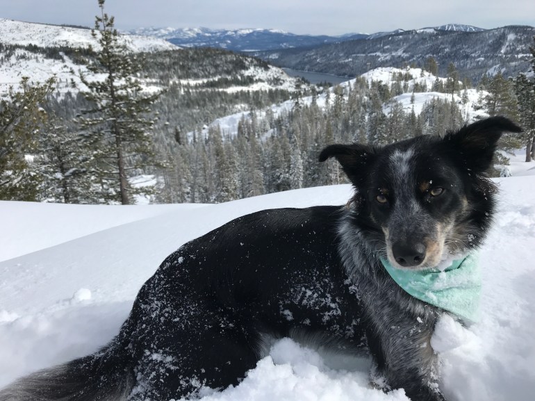 We made slow but steady progress down to Azalea lake and then on to Flora lake where we had a good view over Donner. Poor momma was getting so tired by this point she said we should just turn around so we could at least have some packed trail on the way back to the car. I’ve never seen her tired like that in the snow!! I know she wanted to go snowshoe across the lakes to make it back easier, but the edges seemed mushy so she was too scared we would sink on in.