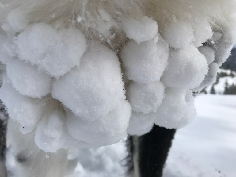 Because we had been plowing through so much snow both of us were totally covered in snowballs. Mine were all over my chest and Lolo’s were on his butt! He wouldn’t sit back in his seat until momma spent about 15 minutes trying to break them apart and even still, he had butt dreadlocks from them that we had to cut out the next day! My chest balls weren’t as bad (since chest hair is shorter than butt hair) so momma just kept breaking mine up so I could lay down comfortably.