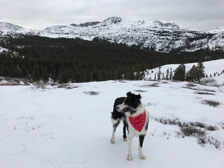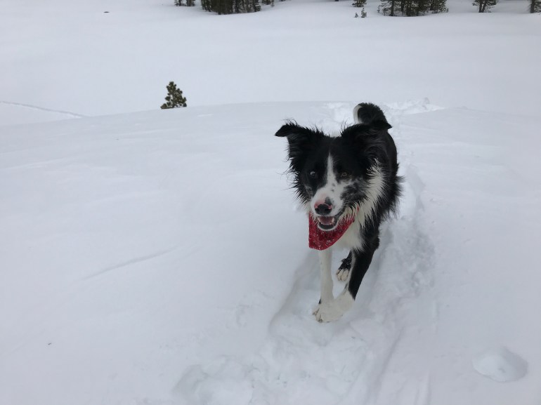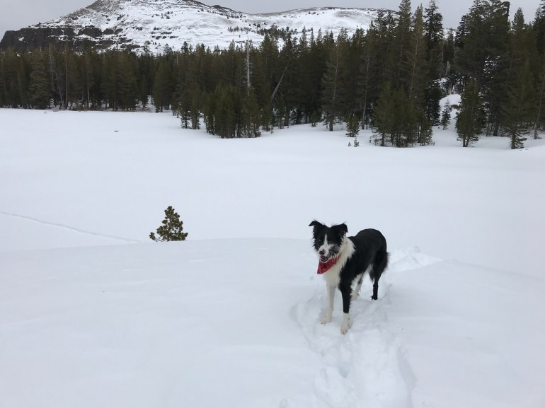 Momma leashed up Loki just to be careful in case the people were on skis and as we got closer, one of them called out momma’s name. Momma thought “I wonder if it is those ladies we once met here and were hiking with?” but it turned out to be another lady momma knew and worked with on the computer many years ago, who is her friend on Facebook. She lives in a nearby town and was camping there in the meadow! So it was the first time momma got to meet her in real life! The funny part was that she saw Lolo and I running around in our bandanas and since she sees pictures of us online she thought “hmmm, that must be Maija because her dogs wear bandanas” (and because we are known to frequent the Tahoe area!). So basically Lolo and I are internet stars is the takeaway I have! 😂 BTW, the reason Momma puts us in bandanas is so she can keep track in her pictures of what day it was and what we were doing.