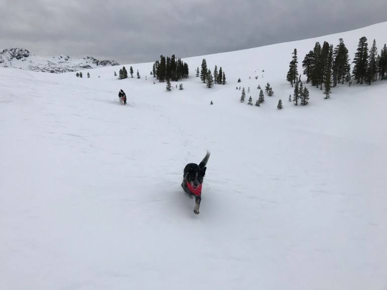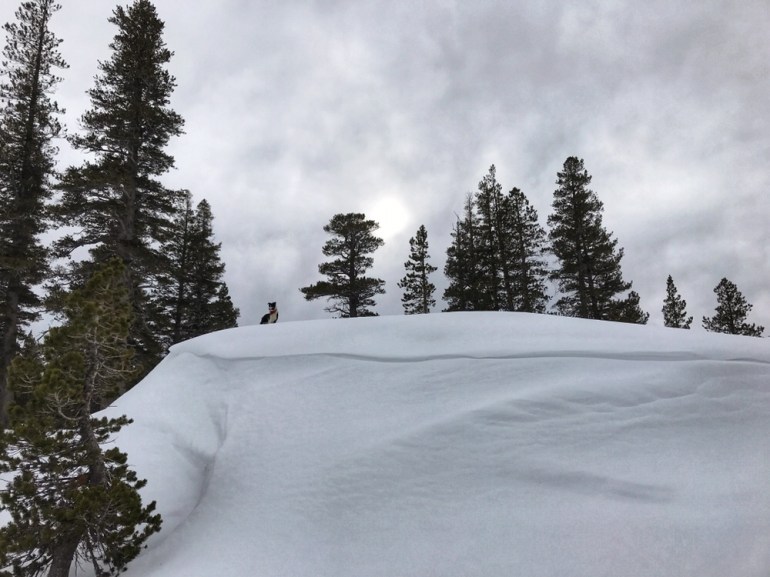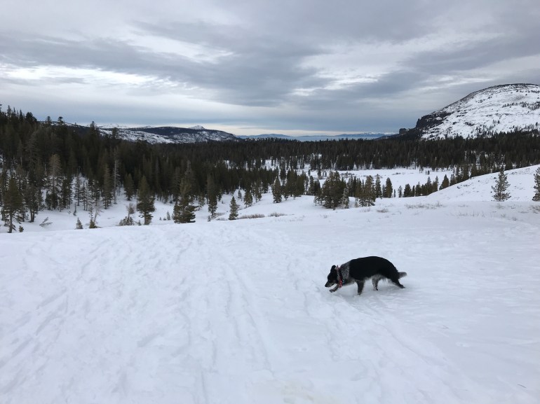 Last Monday momma wanted to see what the snow looked like up by Carson Pass because that was the beginning of our current ‘heat wave’ that will be going into the foreseeable future here. It was supposed to be a partly-cloudy day but when we drove up to the parking lot momma got a little worried that the clouds looked like they may be full of rain! And yes, rain because it was 50 degrees even up at 8500 feet. We are totally getting skunked on winter in the Sierra this year.