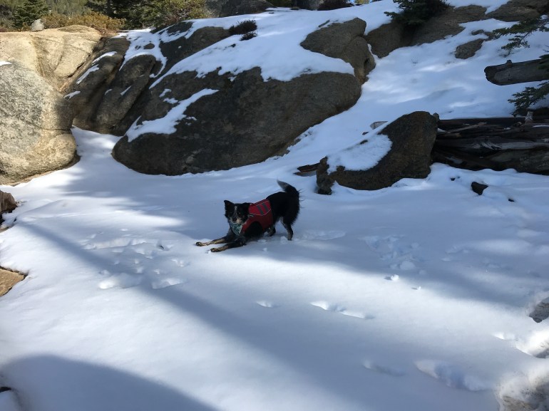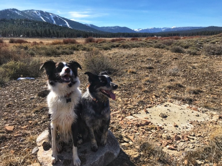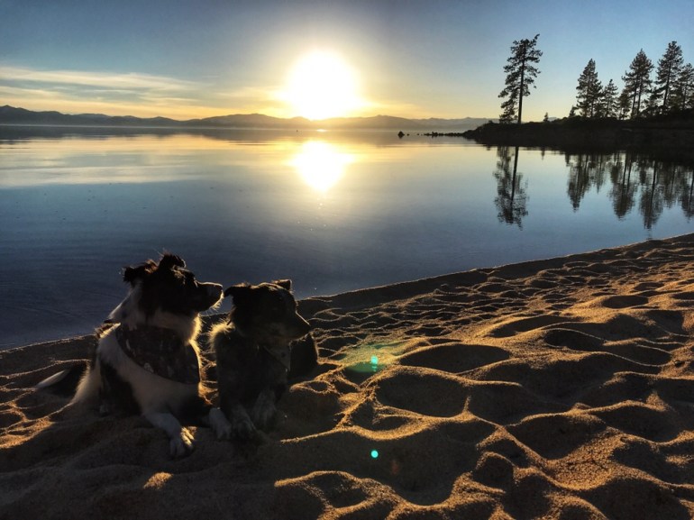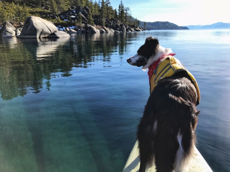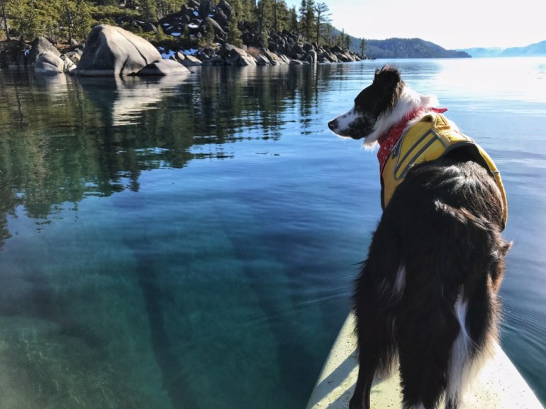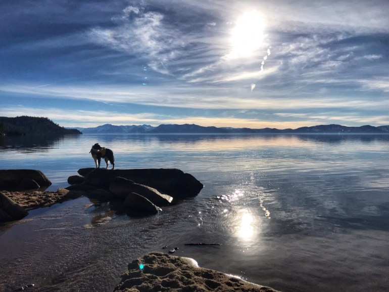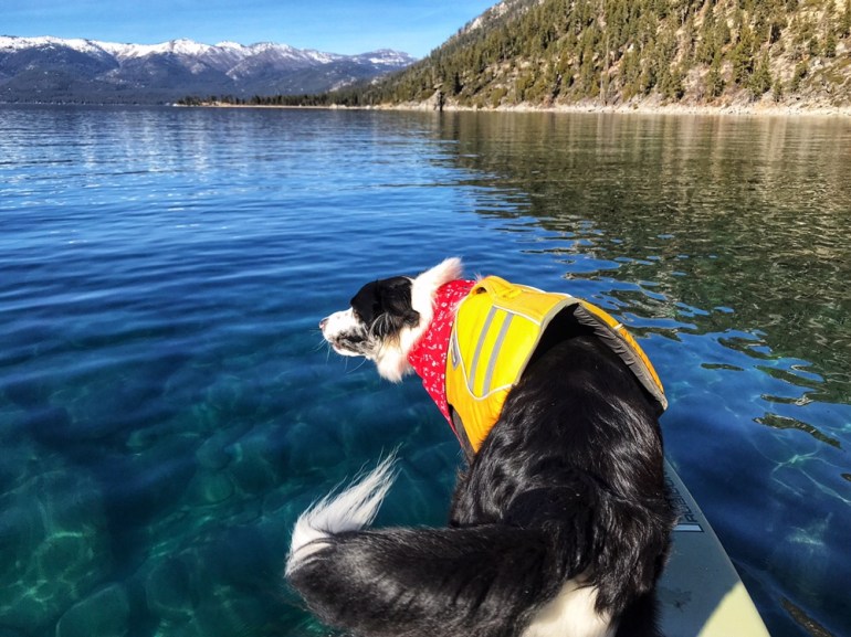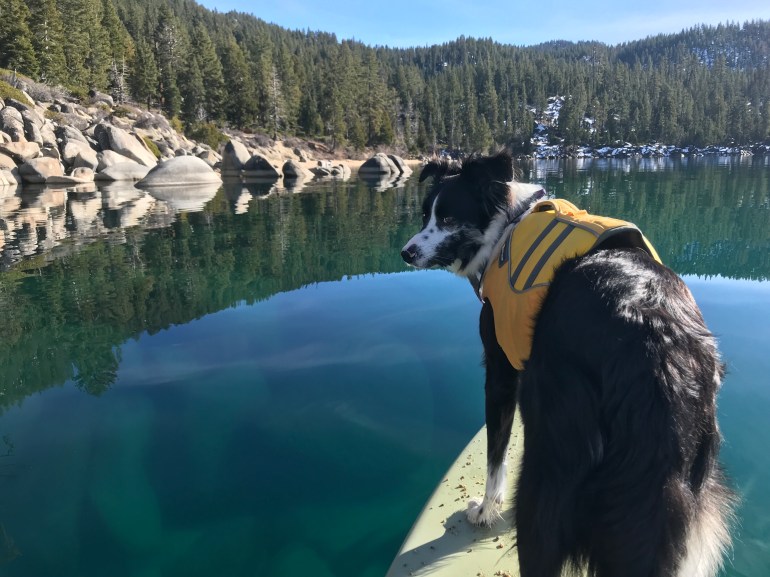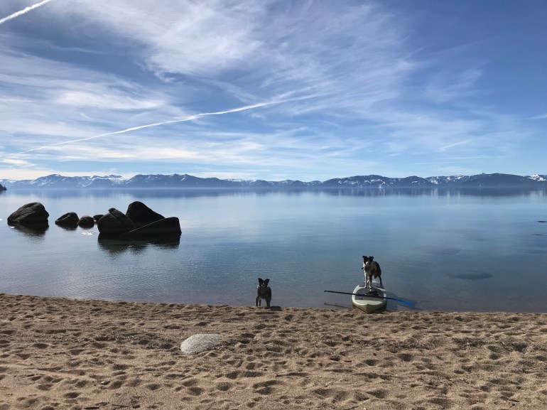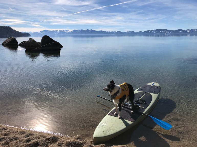 I already blogged about our first adventure on the SUP on our two-sport Tahoe adventure day here, but then on Friday momma took us back to SUP even further than we had on Wednesday after a long walk in Davis. It was a beautiful, sunny day with very calm water, so we paddled 9 miles (well 4.5 miles south of Sand Harbor and then back again). We met a beautiful wolf dog at one of the beaches and tried to get her to play with us, but we couldn’t decide if she though we were weird because of our float coats! Anyways, momma enjoyed talking to her owner while we rolled around in the snow. Friday was groundhog day and momma was joking that she would like to groundhog the day we had since it was so spectacularly perfect weather-wise (and we were so good behavior-wise!).