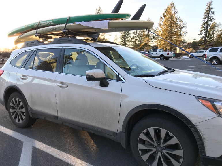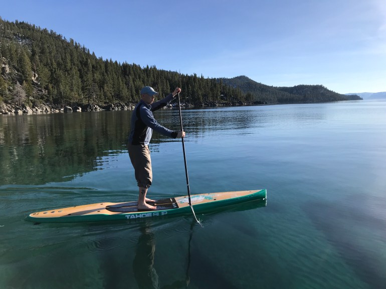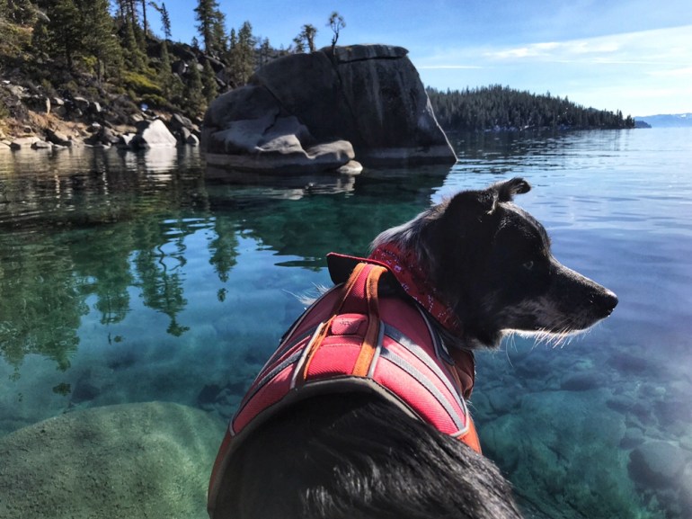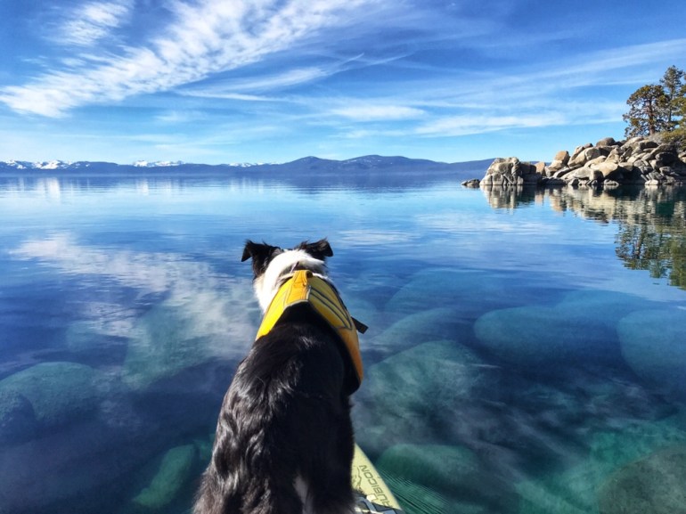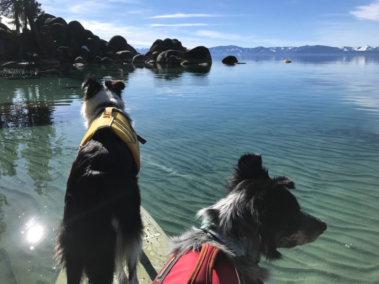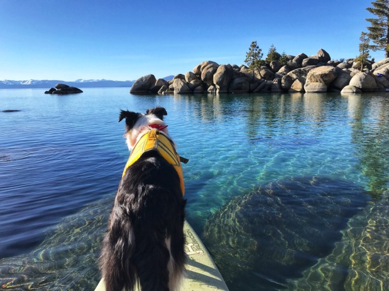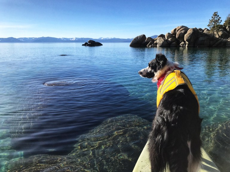 Where to start with our two-day paddle adventures on Lake Tahoe?! Momma is just so in love with paddling here because the water is the clearest she has ever seen, and there are tons of really cool rock and boulder formations under water (that you can obviously see when you look down!). Thanks to the addition of the Thule SUP Taxi to our Subaru, momma has taken us paddling three times in the past week!