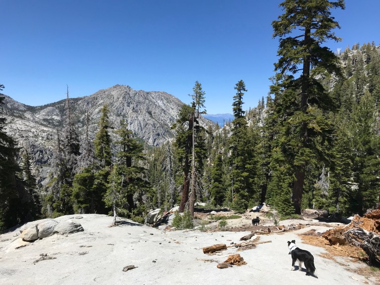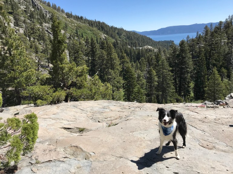Speaking of Desolation Wilderness we did do some hiking up there from our base camp at D.L. Bliss. We went to a trailhead momma had never been to before, at Eagle Falls. She has never gone up there because when we come from the south Bayview is always closer. And we will probably never go back to Eagle Falls TH because it was a SHIT SHOW. There is a short trail that goes up there to the falls and short trails = a bajillion idiot people and their wild kids. Anyways, we made it through the throngs and had a nice hike up to the Upper Velma lake, which is my dad’s favorite lake (so far) in Desolation. We were supposed to backpack and overnight there over Memorial Day, but we canceled because it was still snowing up there. Most of the snow was clear though, so we did have a great time. Lolo, momma and I went all the way around the lake, which was pretty fun. Our human cousin was visiting, so it was fun to show him some landscapes a little different from Florida.