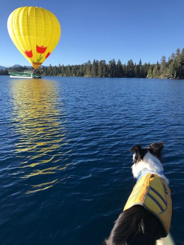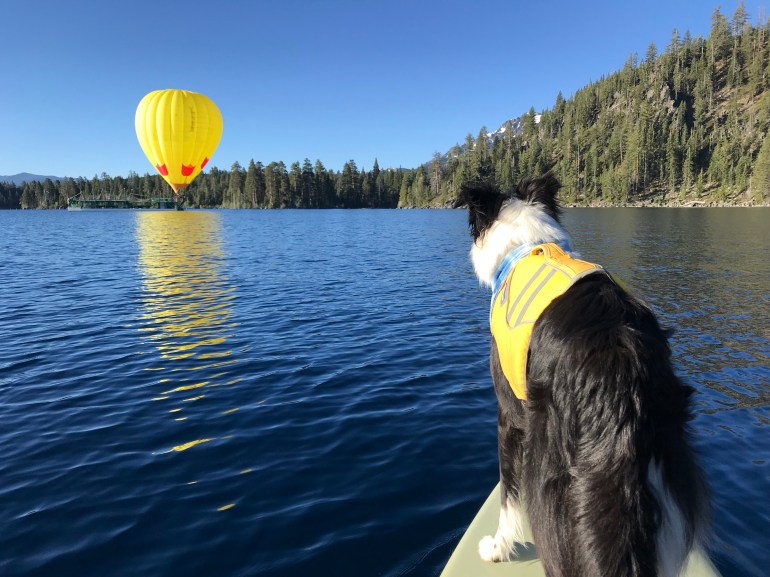 On another trip down to Emerald Bay we got to see this big, giant hot air balloon getting ready to take some folks on what must be an AMAZING tour of the Tahoe area. Since momma likes to paddle early in the morning we have seen this balloon from lots of different parts of Tahoe, but we have never seen it up close. Momma actually wondered where the balloon took off from and landed, but we never expected it was on a BOAT! It was really cool to see up close. I only barked at it once! Momma thinks that tour probably would be an amazing way to see Tahoe because it looks like you get some air time over Desolation Wilderness, too.