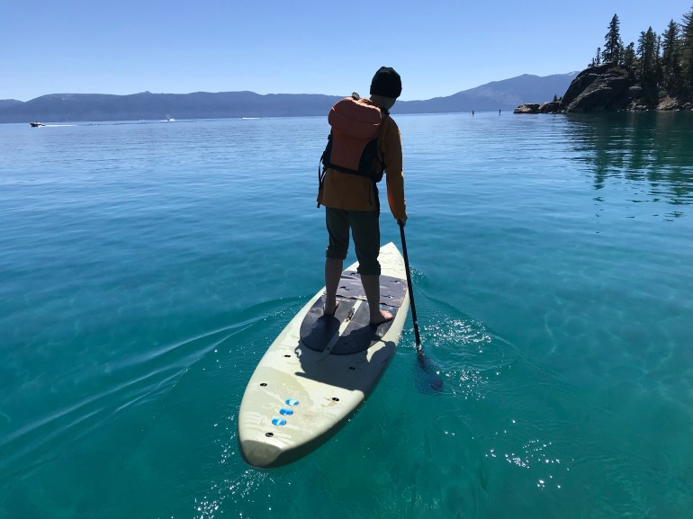 OK so on to the SUP part. Every time we SUP here we get up early in the morning to do so. That’s because the west shore is very popular on Lake Tahoe, so when we get up early we practically have it all to ourselves which is really awesome. We like the calm mornings before the wind and boat wake picks up because we can see all the cool things under the water. The water off the edge of D.L. Bliss gets really deep, really quick! And by deep I mean 1000+ feet deep! Insane! And just a little bit freaky, right?