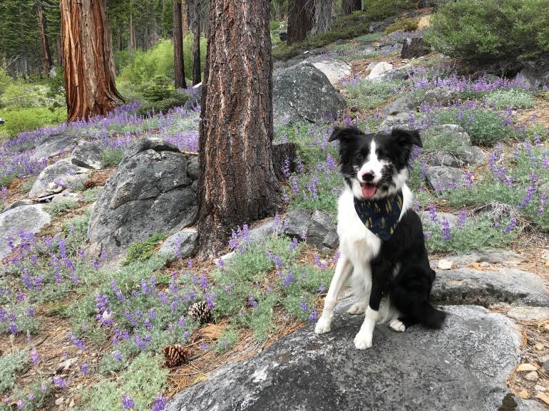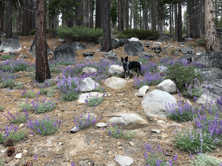 The other hike into Desolation that we did on our second trip to D.L. Bliss was up from the Meeks Bay area to Crag Lake. It is probably the “easiest” way to get up into Desolation because it has the most gradual elevation gain, and not the same amount of elevation gain as any other trail head we’ve ever been to. The flowers were really starting to come out! But momma noticed that I was a bit limp-ier than normal, even on my other feet and discovered that I had blistered and torn open ALL of my feet. ALL OF THEM. We were supposed to be in Tahoe for 4 more days but we had to go home because Lolo also had some blistered paw pads and momma said we are such ding dongs we would keep running on them and making them worse. This was a week before we were supposed to be in Mammoth, so momma was also keen to have us in prime condition for that!
