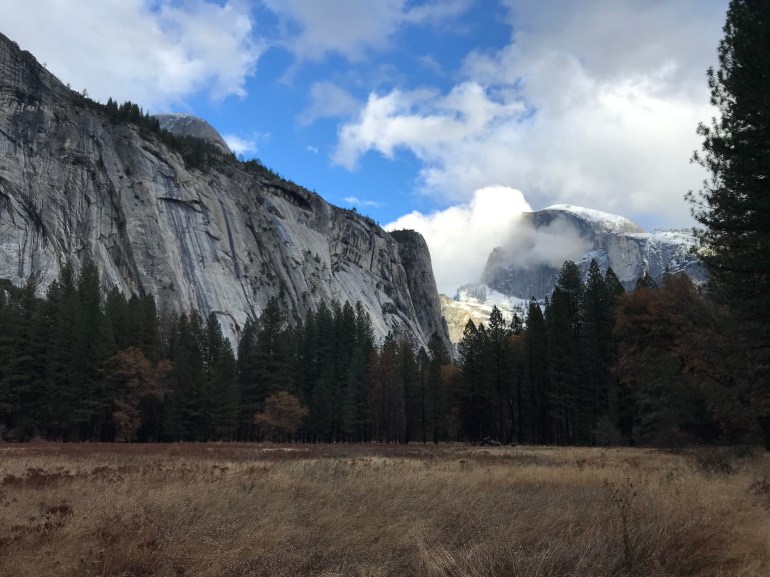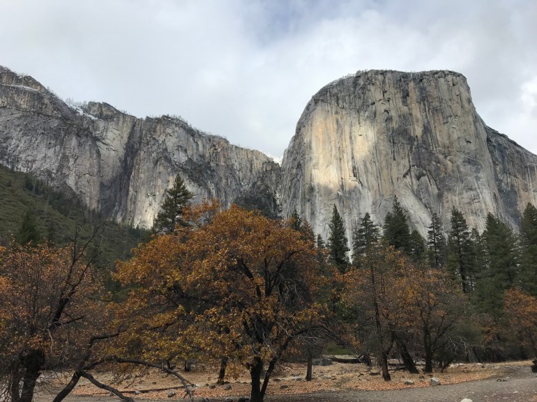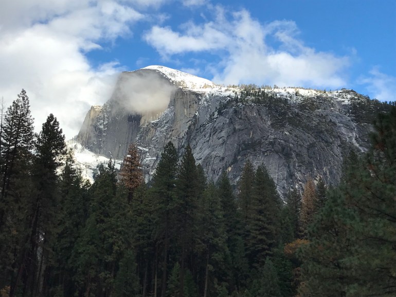 Thursday morning we headed out and went the “long” way around, since we didn’t know if there would be snow up in the pass off Hwy 120. The “long” way is only about 20 minutes longer, and still a pretty way to enter the valley. Lots of rain and some snow had fallen on Wednesday night and Thursday morning, but we really lucked out and had a pretty dry afternoon and evening to explore the valley floor.