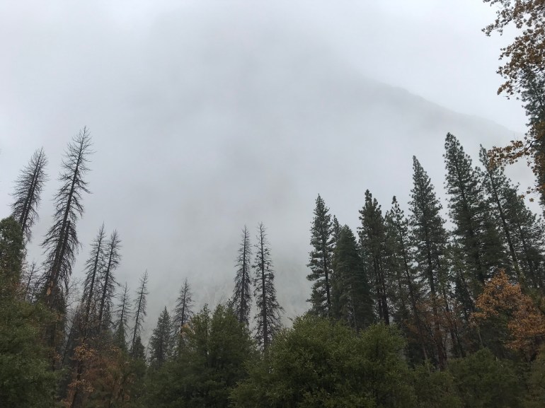We packed up camp and Lolo and I were happy to be out of the rain and in the car while we got lunch and stopped at a few more sites for pictures, including Tunnel View which was entirely a blank slate!